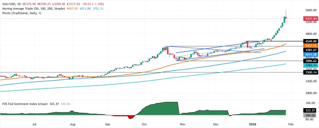 FXStreet分析师Christian Borjon Valencia撰文称,在经历了一轮陡峭的抛物线式上涨后,交易员获利了结,黄金价格从接近5600美元/盎司的历史高位回落。