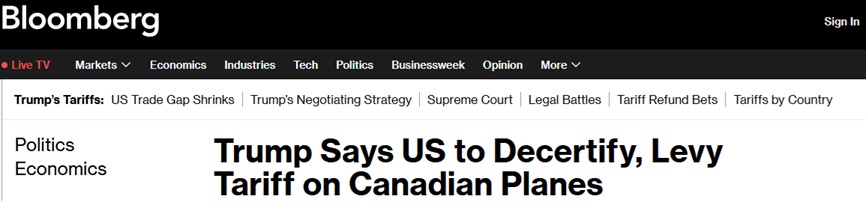 此外,美国总统特朗普威胁称,他将对在美国销售的加拿大飞机征收50%的关税,并在渥太华同意批准由General Dynamics Corp旗下湾流(Gulfstream)生产的部分喷气式飞机之前,撤销对所有加拿大制造飞机的适航认证。
