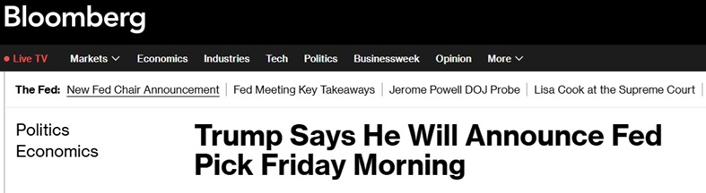 FX168财经报社(亚太)讯 美国总统特朗普(Donald Trump)表示,他将于当地时间周五(1月30日)上午宣布自己提名的美联储主席人选,此举意味着这一历时数月、引发外界对全球最具影响力央行未来走向诸多猜测的遴选程序即将结束。