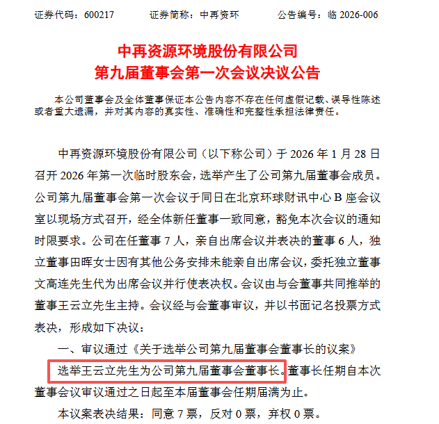 1月28日,中再资环公告,公司第九届董事会第一次会议审议通过《关于选举公司第九届董事会董事长的议案》。选举王云立先生为公司第九届董事会董事长。董事长任期自本次董事会议审议通过之日起至本届董事会任期届满为止。