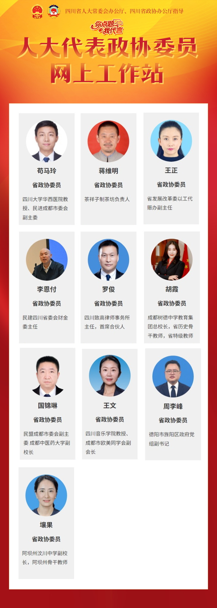 目前,已有首批数十位省人大代表、省政协委员入驻工作站。他们中,既有首次加入的“新面孔”,也有多次参与川观两会相关活动的“老熟人”,让我们一起来看看都有谁吧——