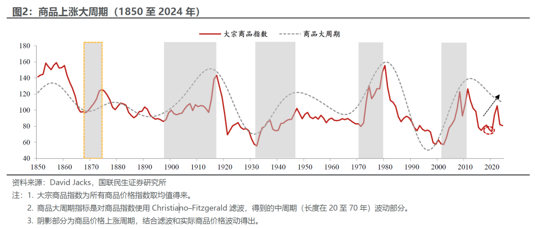 自1850年以来,大宗商品经历了5轮比较明显的上涨周期。如图2,我们结合David Jacks公布的实际商品价格指数,和使用CF滤波后得到的中等长度波动周期(一般是20至70年),识别出1850年以来大宗商品的5轮上涨大周期。