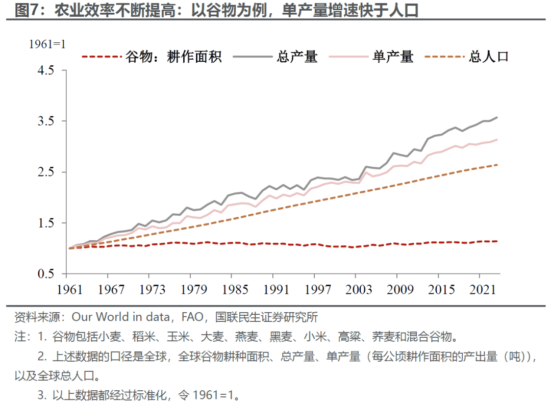 农产品算是比较特殊的品种。从更长周期看(>70年),农产品整体的表现一般,不如其他几类资产、甚至有点跑输通胀。不过有点两点值得注意:一是农产品并不存在明显的资本投入产出的周期,回顾人类历史,就是一部不断解决吃饭问题、农业效率不断提高的历史,农产品价格整体是趋势性下降的(图6);二是,大范围的供给冲击是农产品表现更出色的重要基础。例如,两次世界大战期间农产品表现优异:一方面粮食是战时重要的战略物资(需求),另一方面全球范围内的战火导致农业生产受到极大干扰。