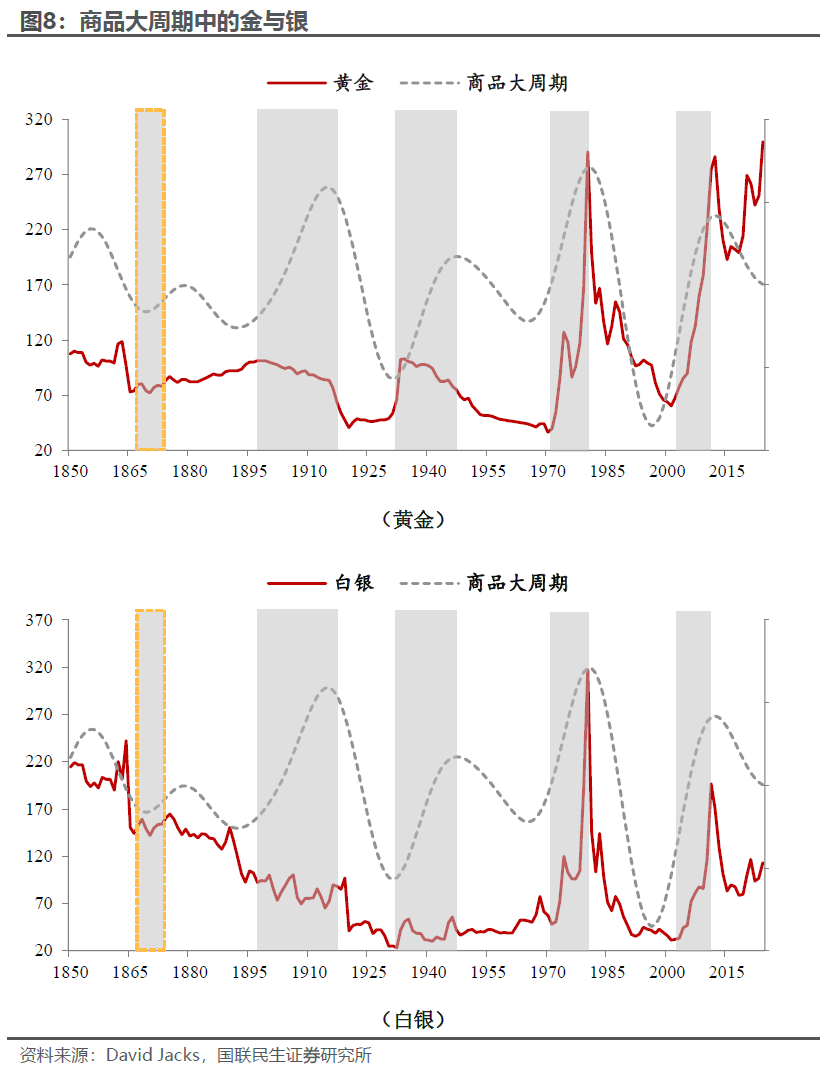 黄金和白银并不一直是“主角”。早期(前三轮上涨周期)金银表现明显不如其他商品,而主要的爆发在最近两轮上涨周期,其中重要原因是早期和货币“深度绑定”,尤其是黄金:19世纪初开始金本位逐步在主要经济体中扩展和普及,期间有大萧条和两次世界大战的冲击,而全球最终告别金本位(包括布雷顿森林体系下的金汇兑制度)要到1970s。而主权货币的信用下沉成为金银的舞台:1970s美元脱钩黄金,以及2000s的“大放水”(初期是科网泡沫破裂带来的衰退,末期则有全球金融危机、欧债危机等)