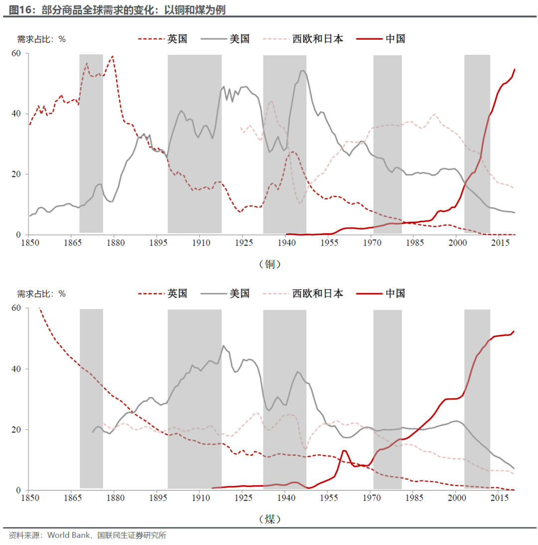 最后,新兴需求的出现是商品大牛市的重要推动因素。如果我们结合战争和技术两个维度,新兴需求往往出现在战争前后或者新技术的转型/协同阶段,如图16,我们可以以铜为例: