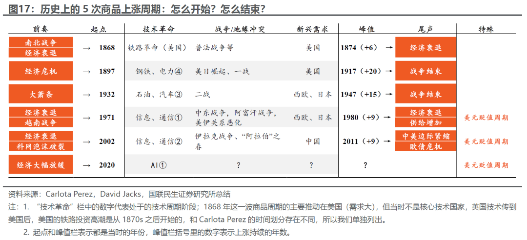 最后,盘点历次商品上涨周期,我们似乎都能找到在技术革命上的突破,在地缘上的典型冲突,以及在需求上出现新兴力量。
