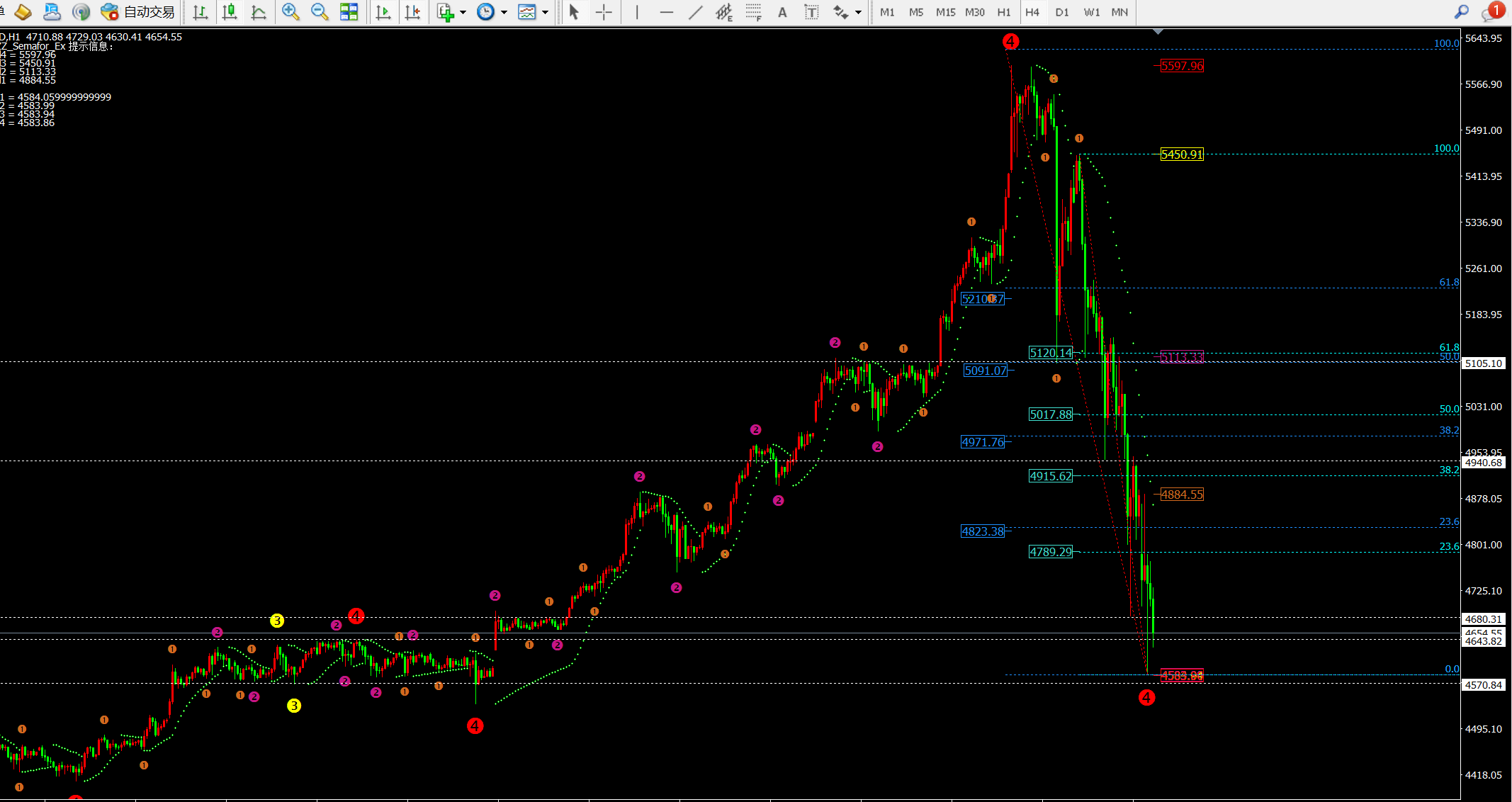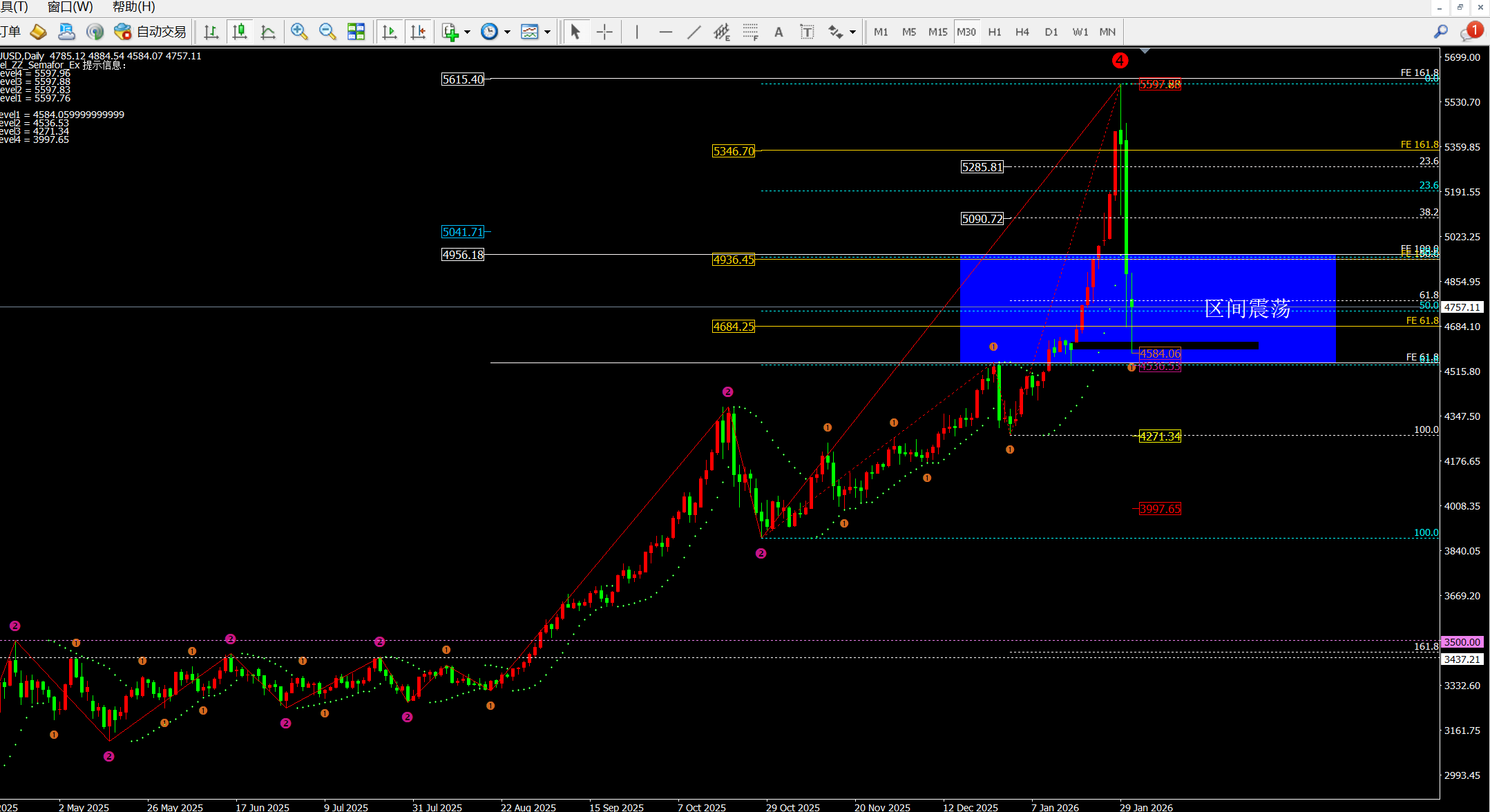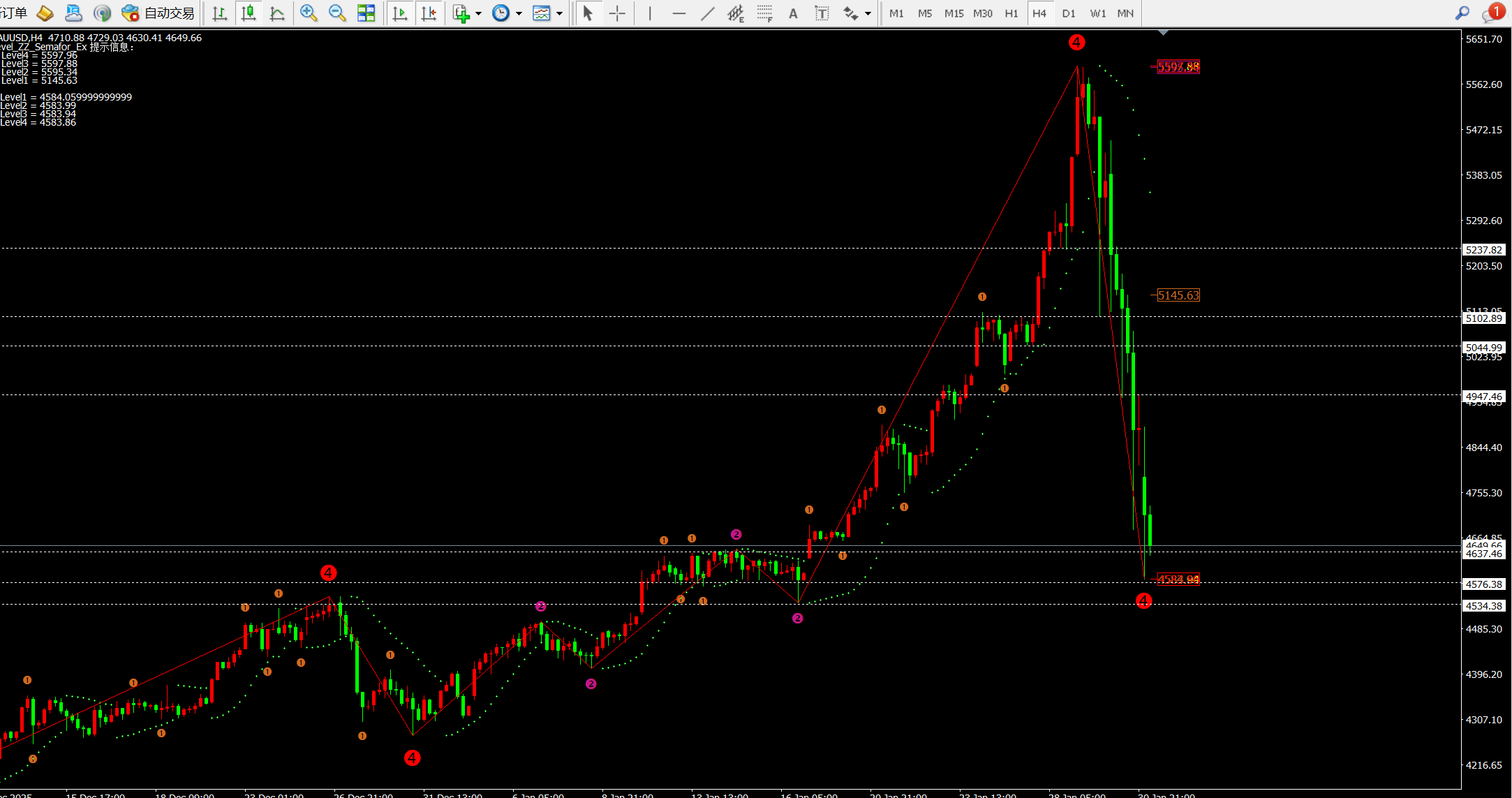 黄金本轮从5600附近下跌至目前的低点4584一线,仅用了三天时间波幅1000美金。而本轮下跌价格首先在5550-5560附近筑顶后跌破5450-5480一线到达5102附近;之后价格反弹到5450附近后进行二次下跌到5112附近反弹5230-40附近,周五再次下破5100到达4943附近反弹5150附近继续下跌4682一线反弹4947附近回落4842一线并在4882附近收盘。