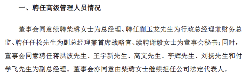 公告显示,2026年1月23日,公司免去柴琇副董事长、总经理职务,并解除其法定代表人身份;与此同时,蒯玉龙因工作安排辞去行政总经理一职,同日经董事会审议通过,被聘任为新任总经理,同步变更为公司法定代表人,任期至第十二届董事会任期届满之日止。