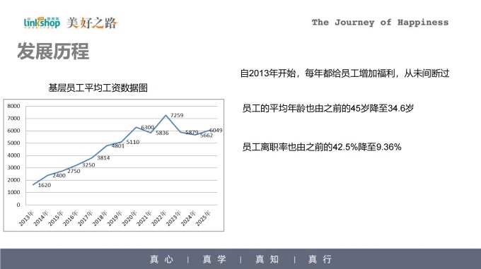 从2013年开始,我们每年几乎只留1%左右的净利润,其余全部发给员工,这从员工收入变化就能看出来。2018年,基础员工平均工资3814元;2019年4801元;2020年5110元;2021年6300元;2022年7259元;2023年5879元;2024年5662元;2025年6049元。