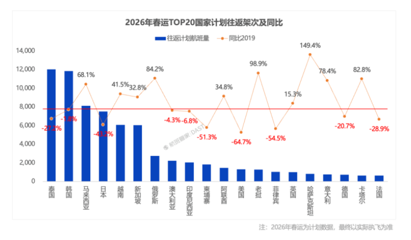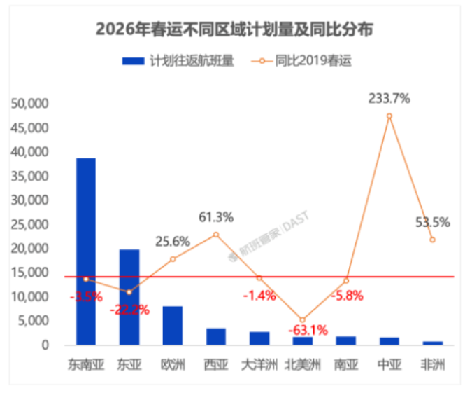 据航班管家预测,2026年春运民航国际市场,东南亚是最热门区域,航班量占国际总量的49%,预计恢复至2019年的96%。
