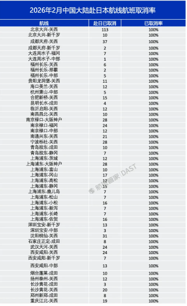 截至1月26日,2月已有49条中日航线取消航班,其中不乏热门航线北京大兴-关西、成都天府-关西、上海浦东-大阪神户等。