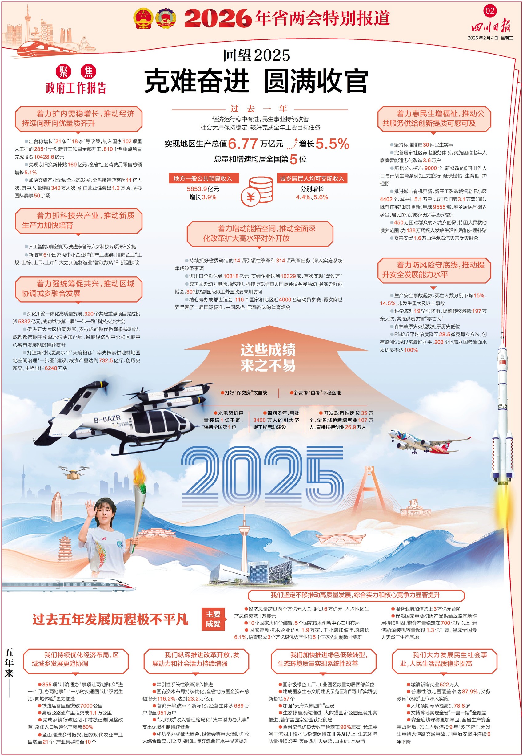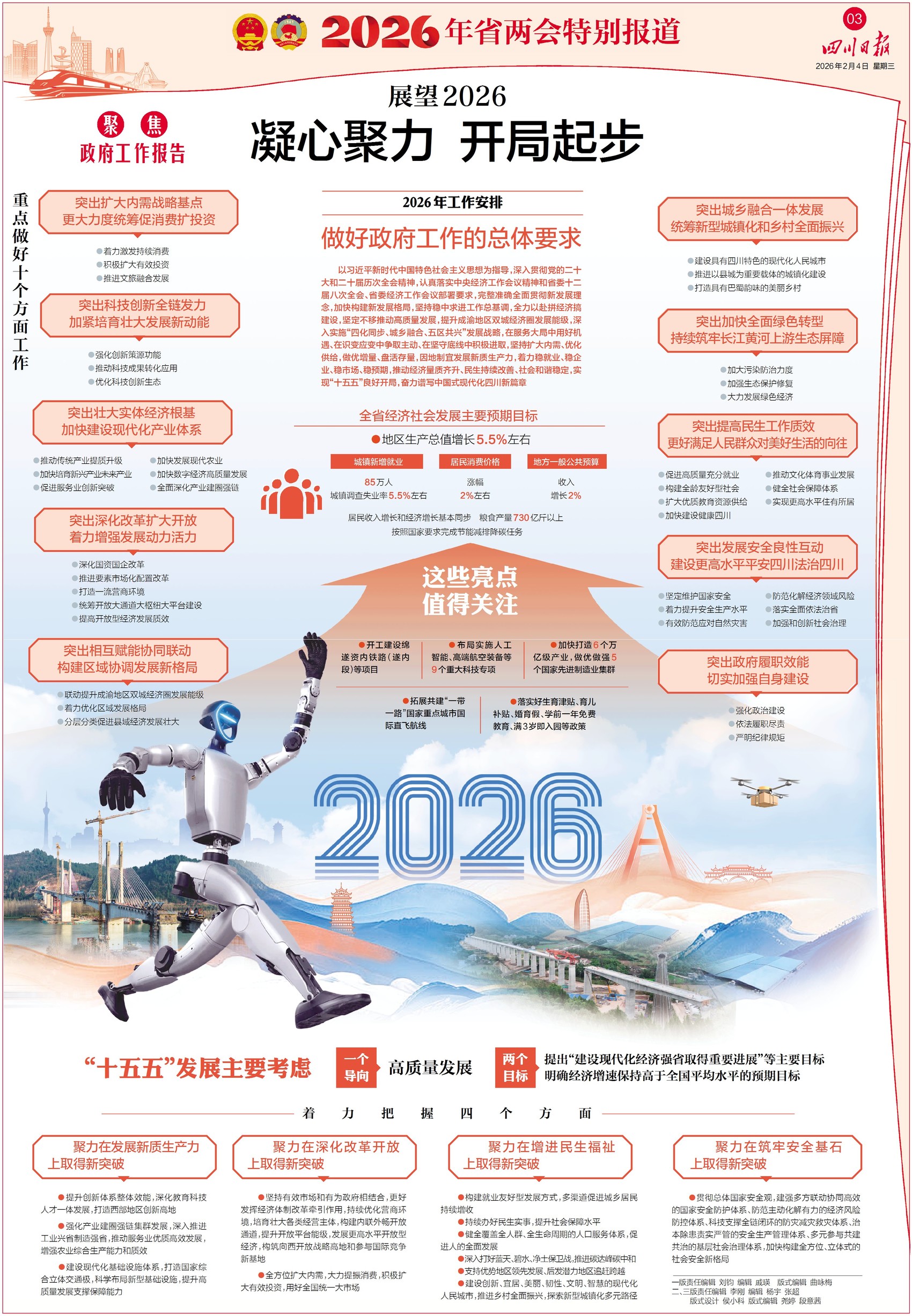 八版为你解读预算报告和计划报告。去年四川的账本情况如何,今年四川将把钱花在哪些领域,有哪些“大账”“细账”值得一说,2026年四川GDP增长目标设为5.5%左右有什么考虑,翻开8版都能找到答案。