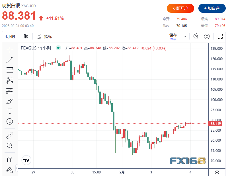 现货白银上涨超过12%,最高触及89.074美元/盎司;白银期货上涨12.5%,报86.57美元/盎司。