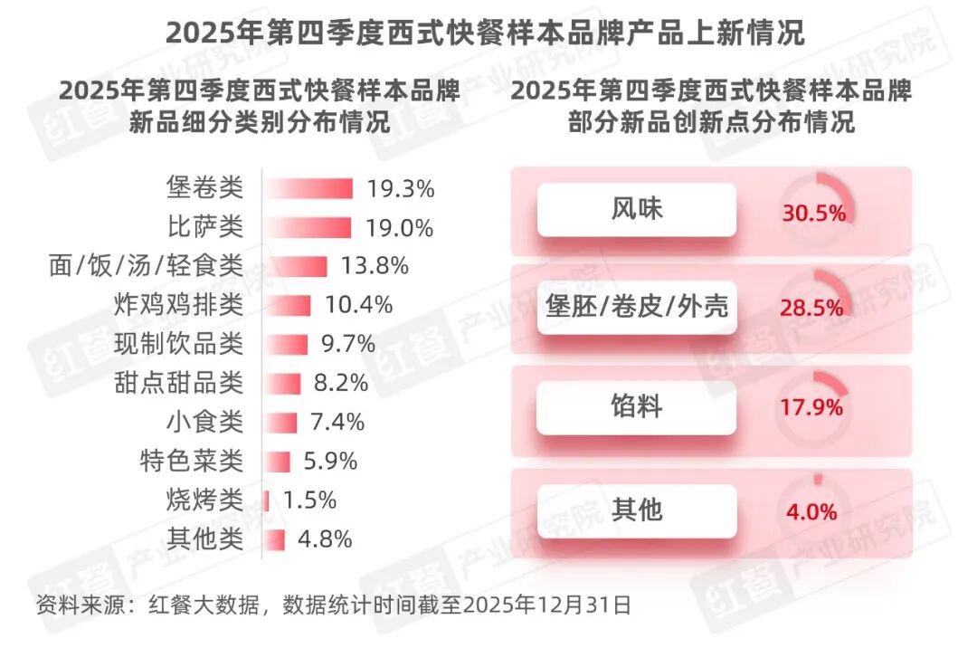 2025年第四季度,红餐产业研究院监测的西式快餐样本品牌中,有36个品牌共推出了269款新品。从新品的细分类别来看,第四季度新品涵盖的类别有堡卷类、比萨类、面/饭/汤/轻食类、炸鸡鸡排类、现制饮品类等10种类别。
