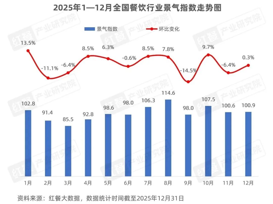 其中,火锅赛道表现相对稳健,10月至12月景气指数分别为114.6、108.7、105.9,季度内始终保持在景气区间;烧烤赛道波动幅度较大,10月景气指数跃升至122.7,环比增幅达48.7%,11月明显下行至88.0,12月回升至112.2,再度回到景气区间;而中式正餐、小吃快餐与现制饮品赛道的景气指数在季度内逐月走弱,分别由104.6、107.2、98.4降至96.9、98.4、91.6。