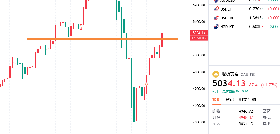 黄金回踩5002/5004附近多,防守4989,目标看5050/5100上方