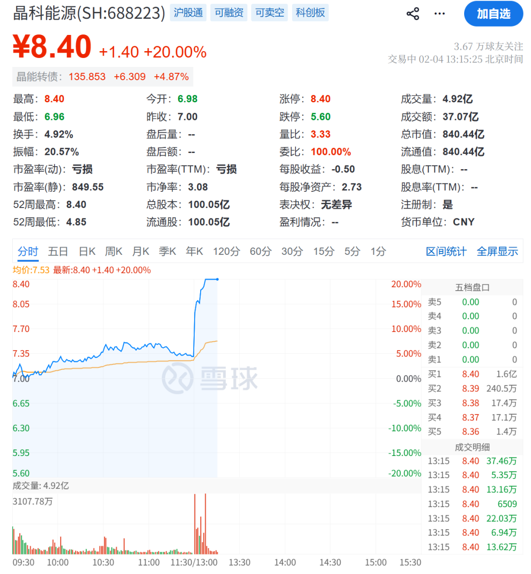 2月4日午后,光伏板块继续冲高。晶科能源迅速拉出20cm涨停,报8.4元/股,总市值达840亿元;截至发稿,买一超1.6亿手。有网友表示,“这封单是我见过最离谱的了”“理解不够”。此外,泽润新能、中来股份20cm涨停,亚玛顿、双良节能、拓日新能等多股延续涨停状态。消息面上,有市场传闻称,马斯克团队近期秘密走访了中国多家光伏企业,考察项目涉及设备、硅片、电池组件等环节,其中重点考察了有异质结、钙钛矿技术路线的光伏企业。对此,晶科能源方面工作人员回应称,公司近期确实与马斯克团队相关考察团有过接触,考察团对公司的技术储备、生产设备等进行了了解,但合作意向及具体考察细节不便透露。该工作人员同时透露:“对国内主流光伏企业均有考察。”此前,马斯克在达沃斯论坛上对中国光伏产业表示肯定,中国太阳能年装机超1000GW,配合储能的稳态供电可达250GW,相当于美国全年用电量的一半。马斯克表示,SpaceX与特斯拉正同步推进太阳能产能提升,目标是在未来三年内实现每年100GW的太阳能制造能力,用于地面数据中心与太空AI卫星供能。另外,近期SpaceX在官网发声明,宣布已收购同属于马斯克旗下的人工智能企业xAI公司。马斯克将此次合并称为实现SpaceX“下一个篇章”的一步:在轨道上建造比地球上效率更高的巨型光伏电站,并与人工智能数据中心相结合。中金公司近期研报指出,在商业航天蓬勃发展的背景下,太空光伏作为其电源系统升级的核心方向,在星座批量组网的牵引下正迈向技术路线升级与产业化交付的新阶段。随着我国低轨星座进入密集部署期、单星功率持续上行叠加太空算力等新应用场景推进探索,建议把握太空光伏带来的全产业链变革,持续关注制造产业端落地密集催化。