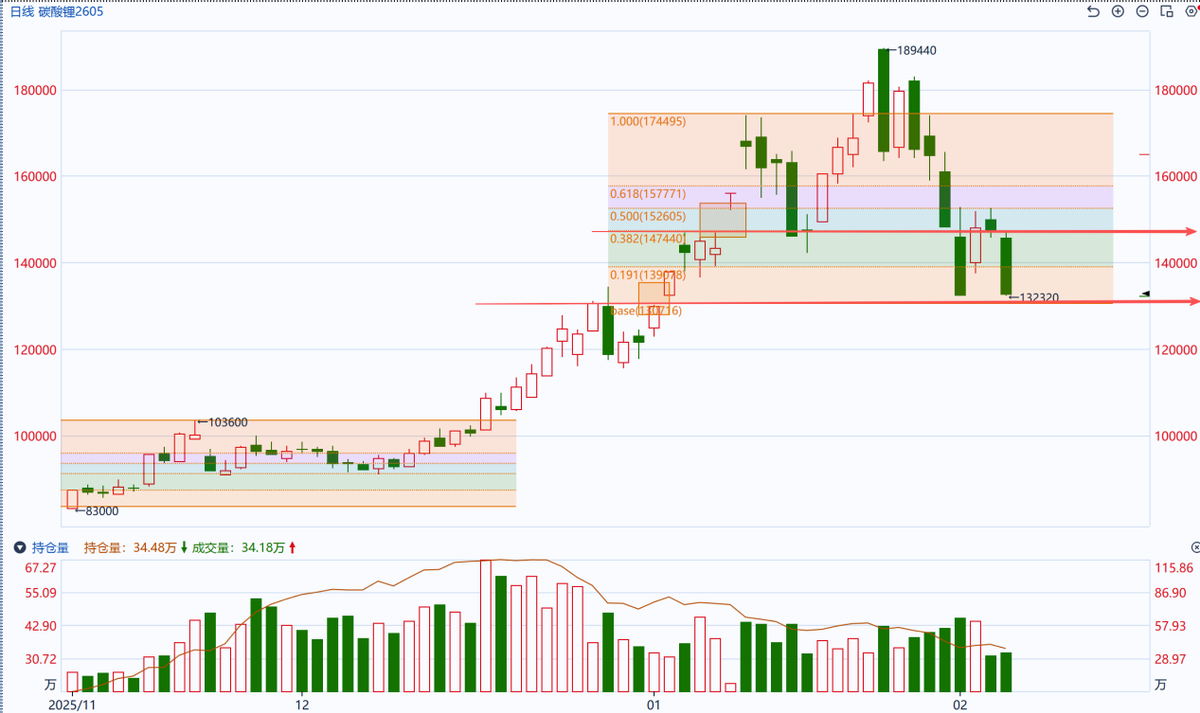 碳酸锂主力LC2605合约未能有效守住黄金分割线0.382分位点,今日呈现减仓下跌态势,盘面再度显露弱势迹象。从技术形态观察,当前调整可能已超出单纯的技术性回调范畴。