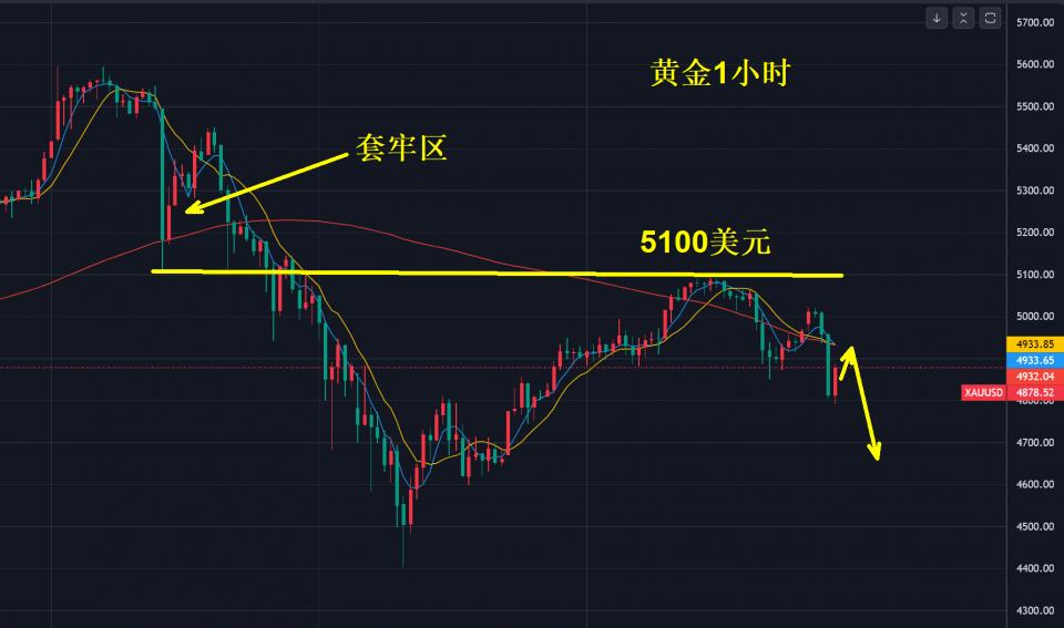 这次黄金反弹刚好卡在5100美元,这不是巧合,上周四从5600美元首次跌下来5100美元是强支撑,后来反弹到5400美元击穿了5100美元的支撑,恰恰因为反弹大量多头选择在5100美元附近入场,后来的下跌被套。