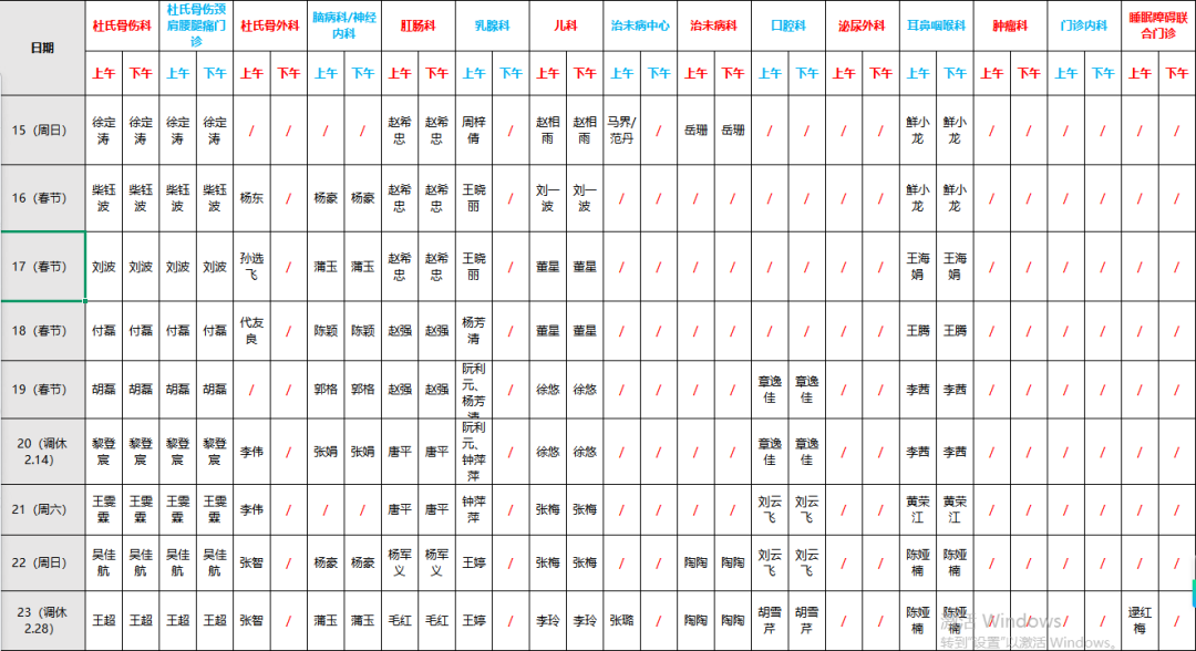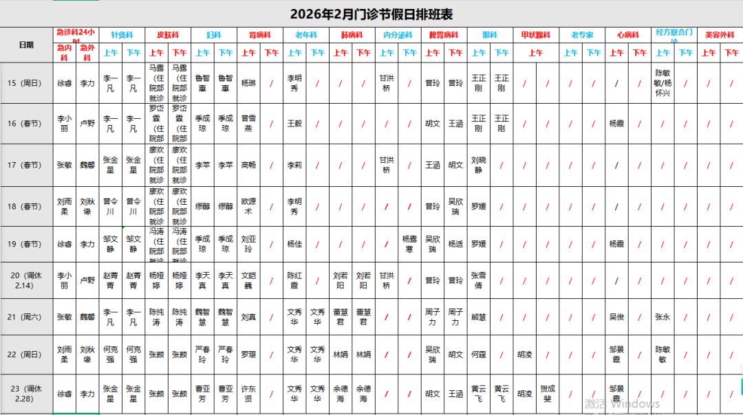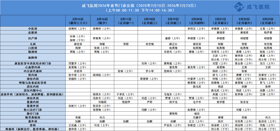 根据国家法定节日的安排,2026年春节连续放假9天,即2026年2月15日(星期日)至2026年2月23日(星期一),2026年2月14日(星期六)全院正常上班,按照星期x门诊安排坐诊。为确保医院正常诊疗秩序和安全稳定,为广大病友提供优质、高效、便捷、有序的诊疗服务,通用医疗成飞医院提前做好了节假日期间工作安排,现将节日期间门诊医生、医技检查安排表通知如下: