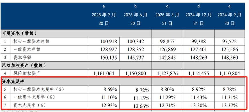 截至2025年前三季度,该行核心一级资本充足率、一级资本充足率分别为8.69%、11.10%,分别较上一季度末下降0.03、0.05个百分点,不过资本充足率较上一季度末上升0.33个百分点,达12.93%。