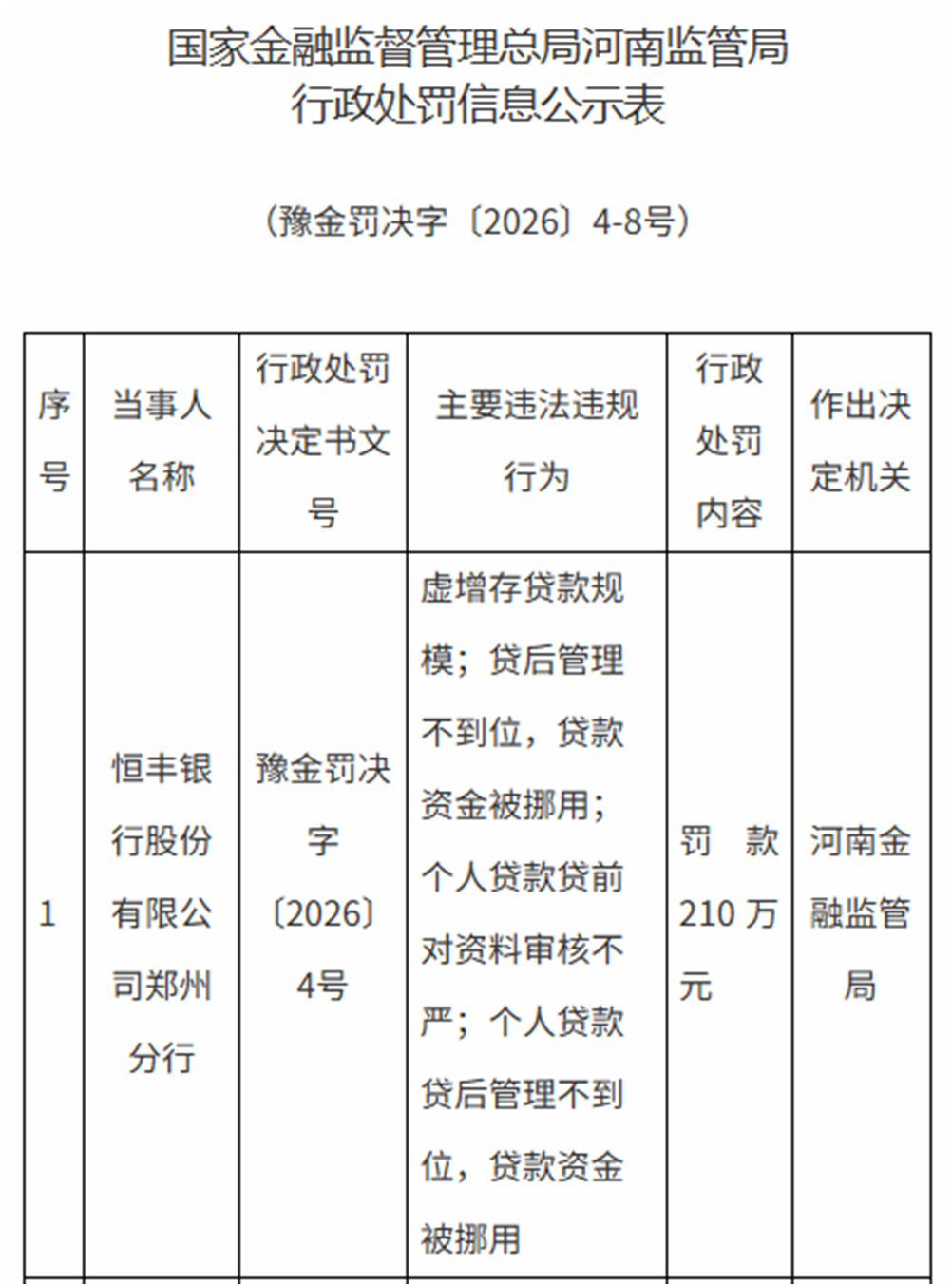 1月28日,国家金融监管总局河南监管局对恒丰银行郑州分行开出210万元罚单(罚单编号:豫金监罚决〔2026〕4-8号),直指四项违规行为:虚增存贷款规模、个贷贷前对资料审核不严、个贷贷后管理不到位致资金被挪用、贷后管理不到位。
