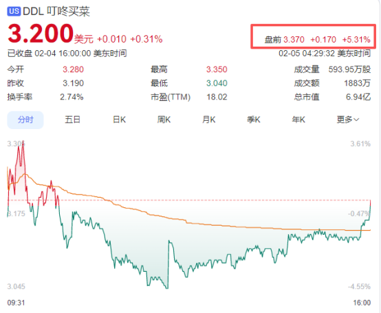 截至最新收盘,叮咚买菜市值为6.94亿美元。2月5日,叮咚买菜美股盘前大幅拉升,一度涨近10%,目前涨幅收窄至5.31%。