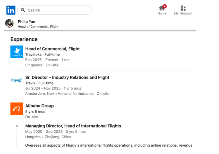 上周,曾任携程高管的Philip Yan在LinkedIn宣布加入Traveloka,担任机票业务商业负责人。