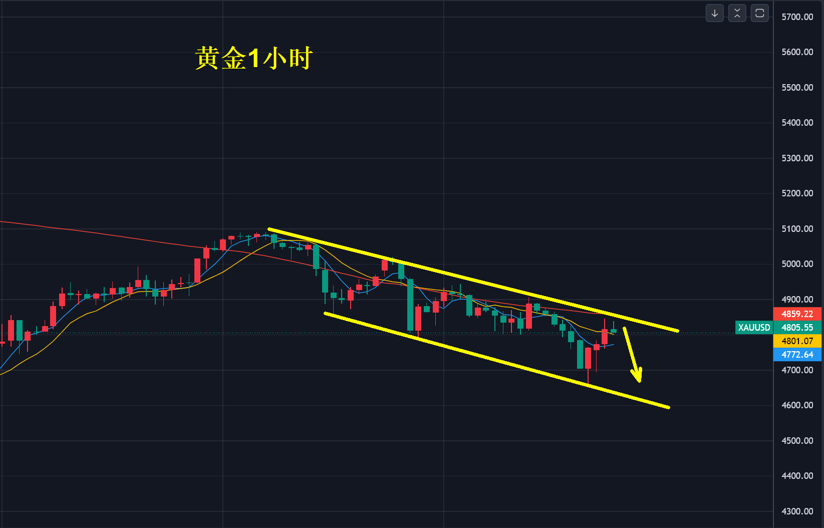 周四金价延续了一轮下跌到4650美元附近,我在《黄金按下“暂停键”,还能做时间朋友吗?》文章结尾明确表示下跌还会进一步延续,5035美元作为多空分界点,在此位置下面反弹空,向下看4750-4680美元,走势与预判完全吻合,尤其亚盘下跌欧盘延续,美盘胶反弹4765-70美元就是诱空。