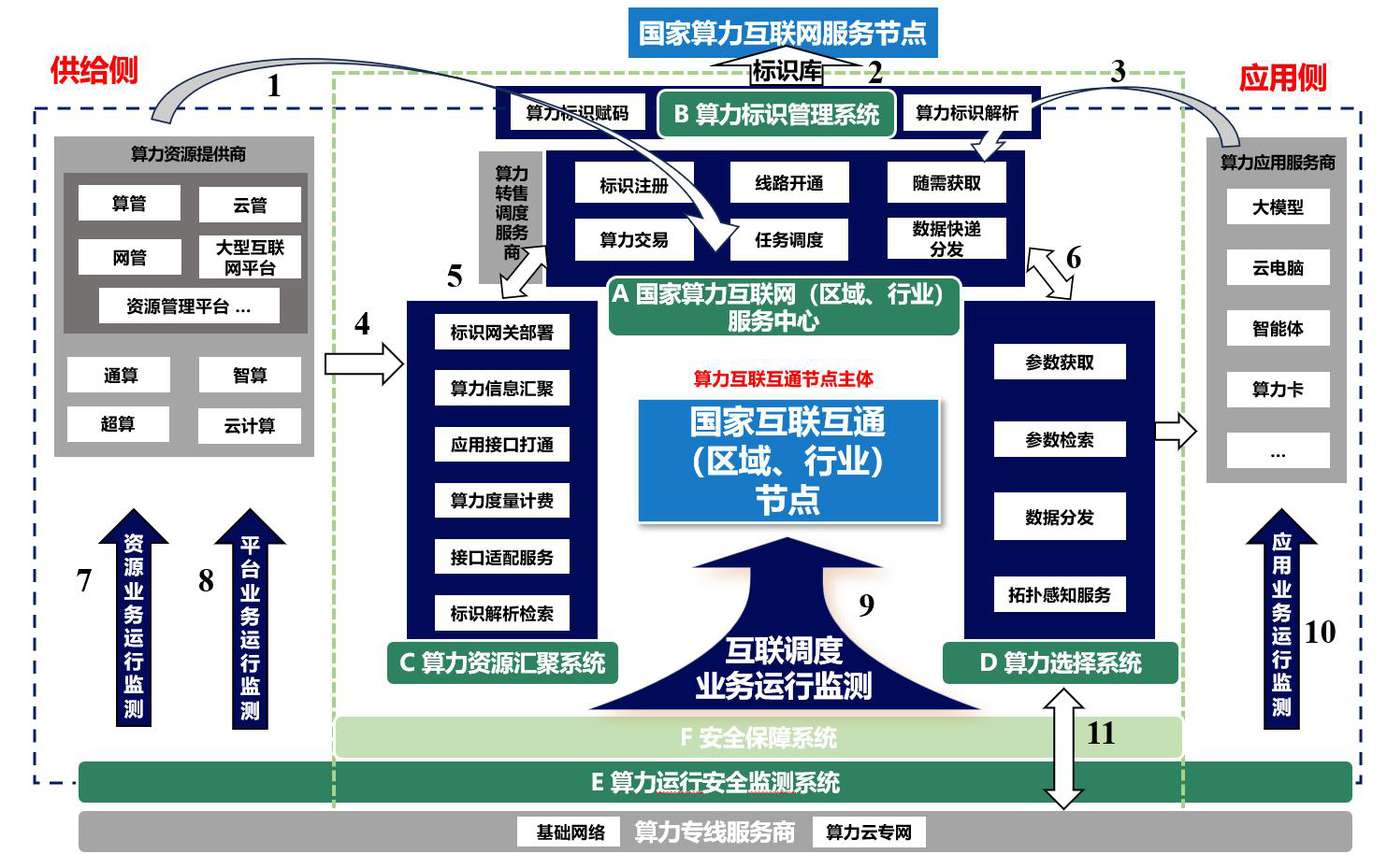 五是算力运行安全监测系统(E)。通过算力标识网关实时获取算力资源侧、平台侧、互联调度侧、应用侧的业务信息,实现算力运行安全监测。
