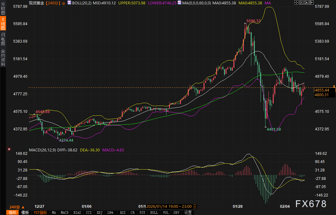 从提供的四小时图技术指标观察,黄金当前处于一个关键的修复与抉择阶段。金价目前运行于布林带中轨(约4853美元)附近,这是一个短期多空分界的参考位置。布林带通道本身呈现出极度扩张状态,上轨位于5160美元,下轨位于4546美元,如此宽阔的通道直观反映了近期市场异常剧烈的波动范围。价格在经历了前期暴跌后,目前反弹至中轨附近,测试其有效性。