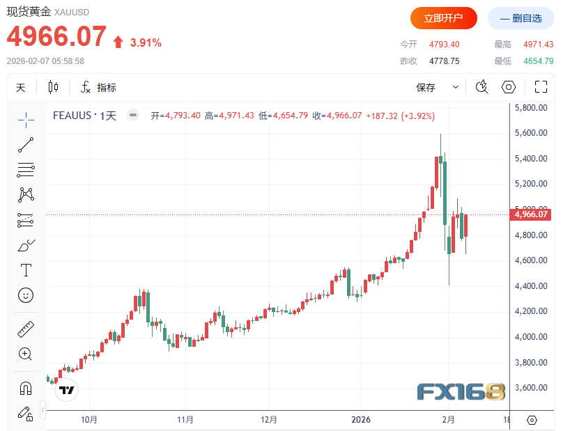 在这轮震荡中,黄金始终未能稳站5000美元关口上方。周五(2月7日),现货黄金收报4966.07美元/盎司,当日上涨3.91%或187.32美元,本周上涨1.55%或75.89美元。