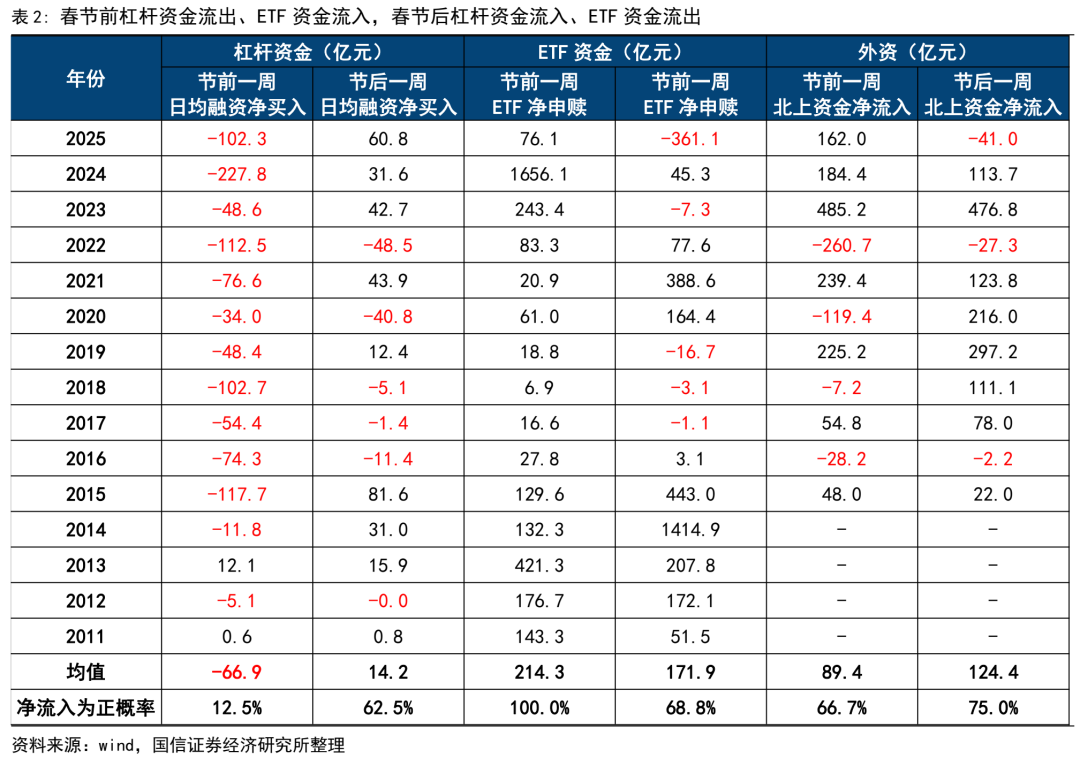 杠杆资金节前明显流出、节后转为流入。从2011-2025年期间数据看,春节前杠杆资金往往明显流出,节前一周日均融资净买入为-66.9亿元,仅有2011、2013年日均融资净买入为正。节后一周杠杆资金有明显加仓行为,日均净买入为14.2亿元。