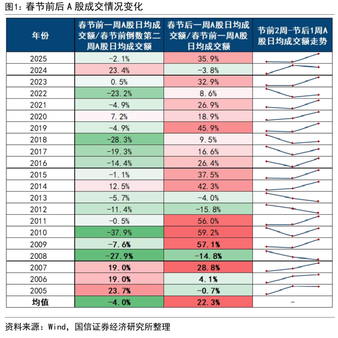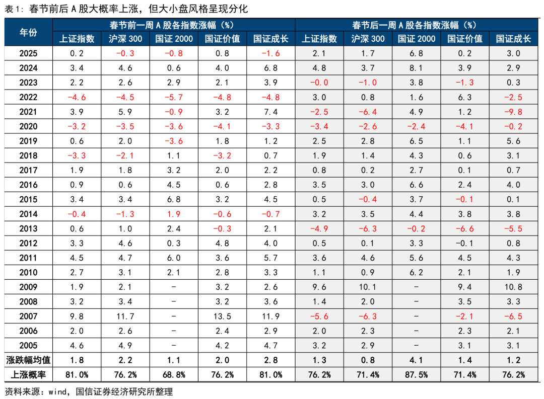 春节前成交清淡,节后通常能逆转,春节前后A股上涨概率大。由于春节假期A股休市较长,部分投资者为规避海外市场波动等可能发生的不确定事件,市场交投热度往往下滑。2005-2025年间,春节前一周A股成交金额较前周平均缩量4.0%。而节前的清淡交易在节后往往得到逆转,春节后一周A股成交额较春节前一周平均放量22.3%。不过春节前后A股上涨概率均较高,其中春节前一周上证指数上涨概率为81%、涨幅均值为1.8%,节后一周上涨概率为76%、涨幅均值也有1.3%。