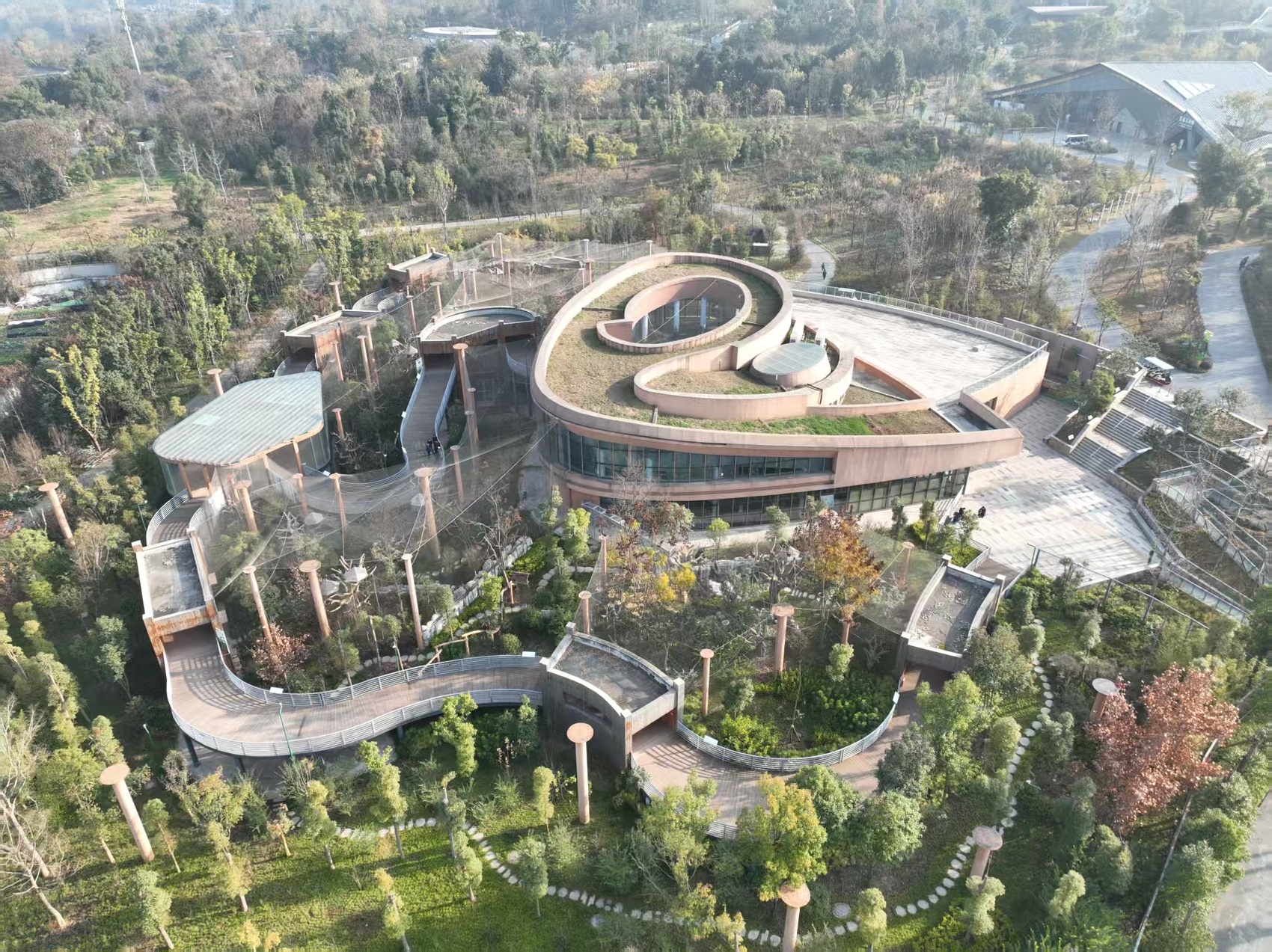 金丝猴馆则创新性打造了川金丝猴、红腹锦鸡与小熊猫的“混养”模式。首批入驻的“居民”,包括新引进的4只川金丝猴、26只红腹锦鸡以及10只小熊猫。针对三类物种的习性差异,场馆采用“视觉混养,物理分区”的设计方案,利用科学分区布局,使不同物种在视觉上仿佛共处同一空间,但实际活动区域有着物理分隔。