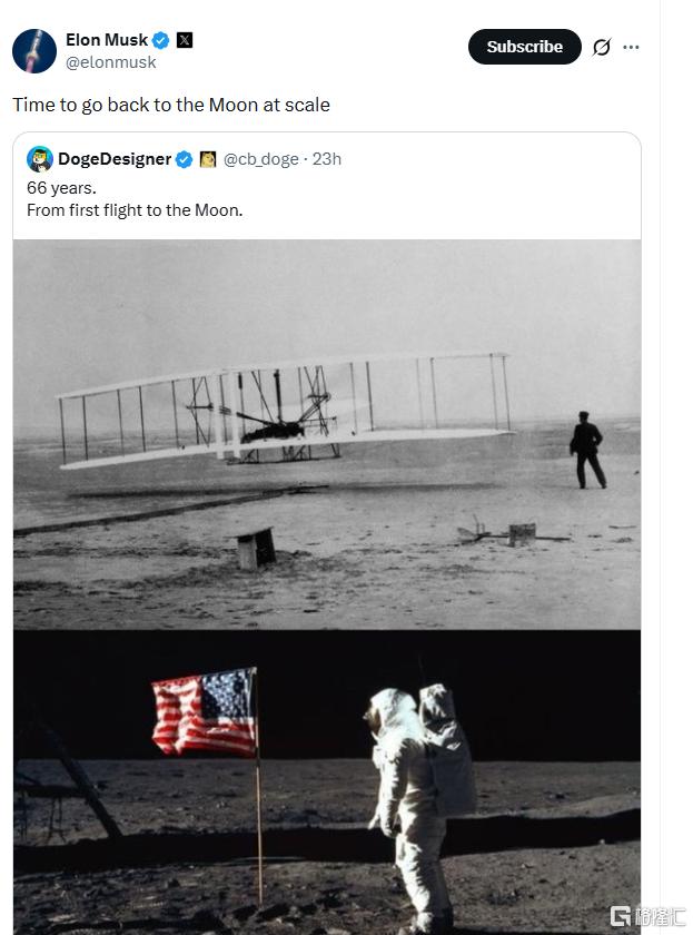 马斯克发帖表示,是时候大规模重返月球了。