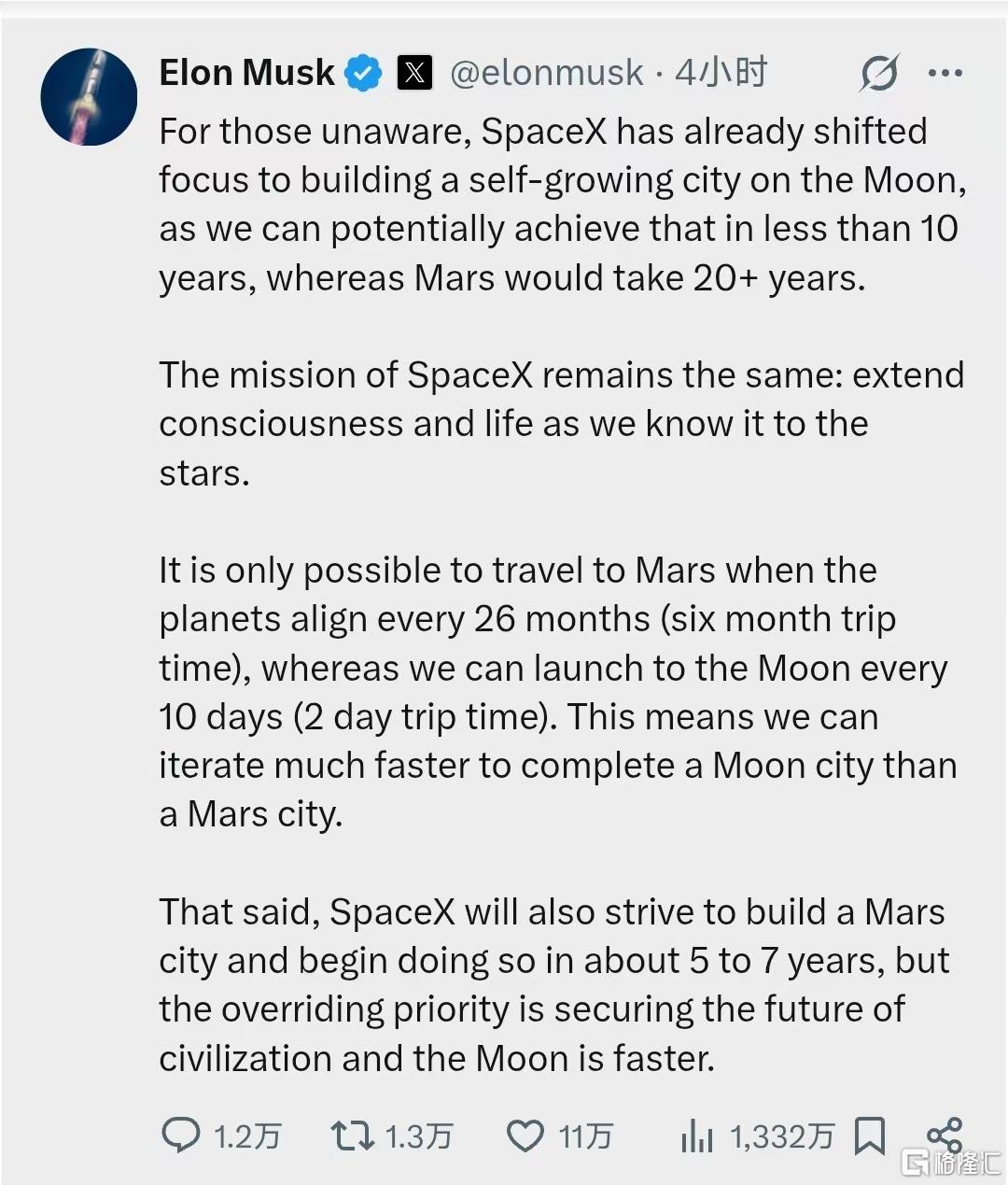 “不过,SpaceX也会致力于在5到7年内开始建造火星城市,但最重要的优先事项是确保人类文明的未来,而月球则是实现这一目标的更快途径。”马斯克说道。