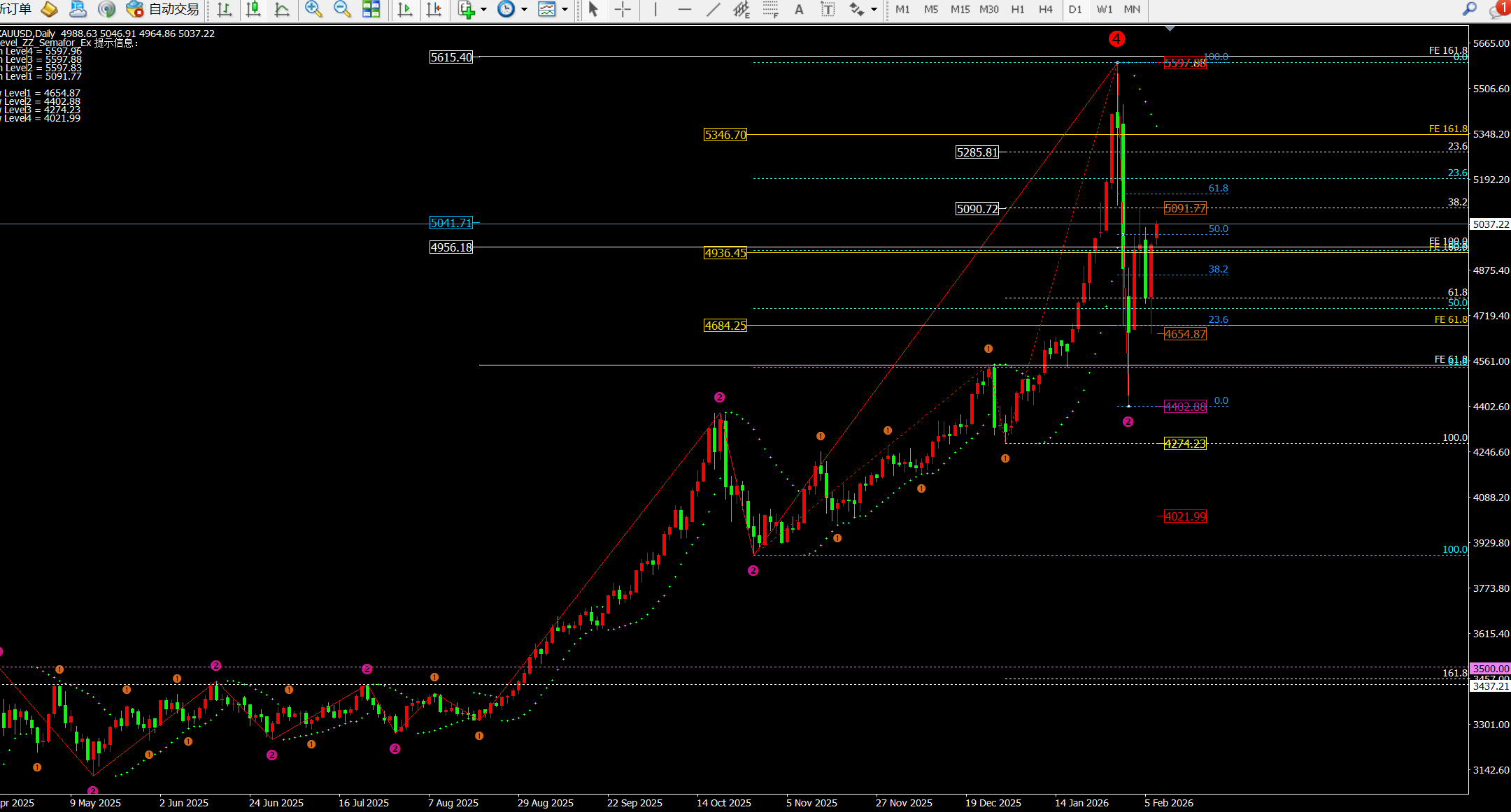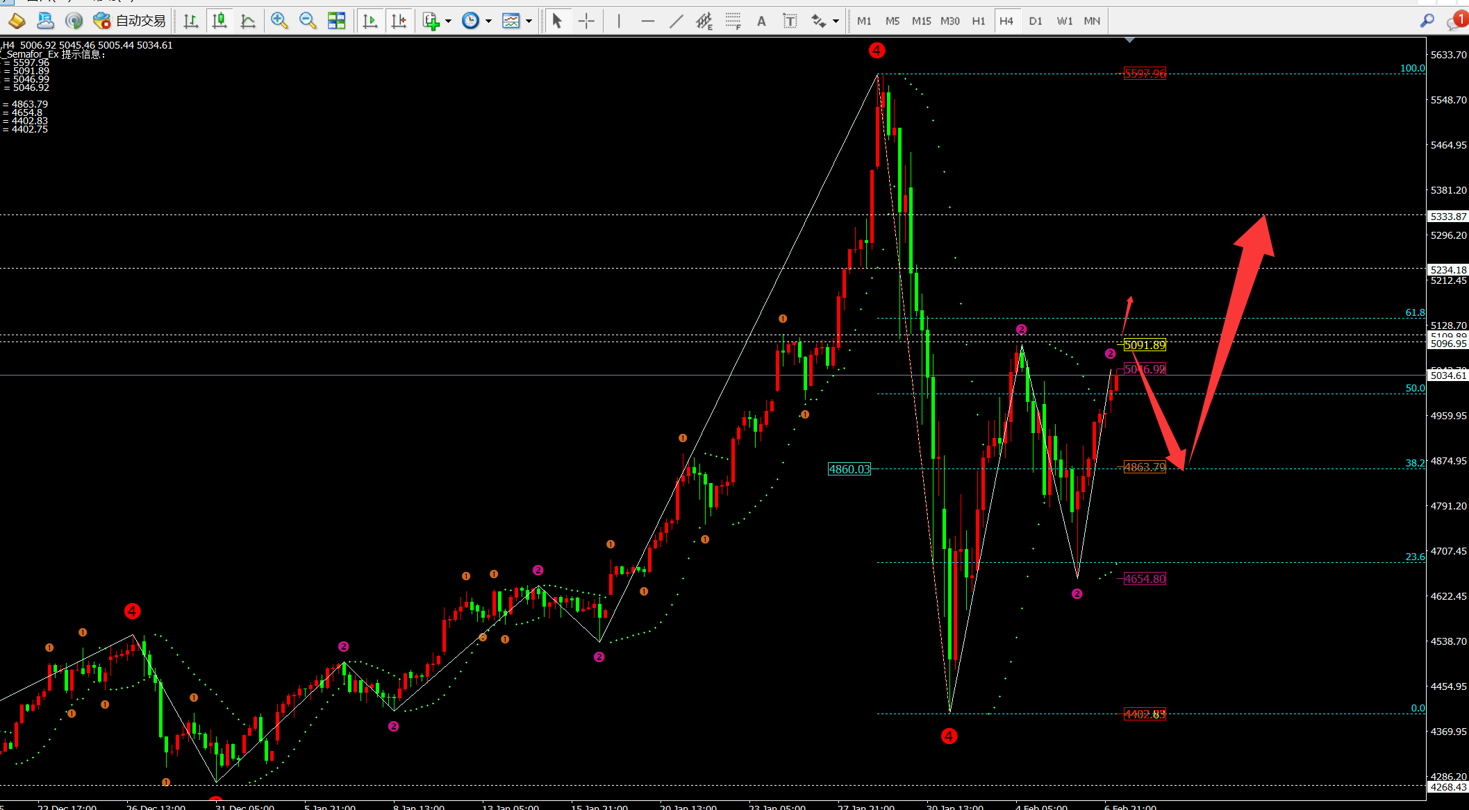 ② 日线上周五以带有下影线的光头阳柱收尾,代表今日价格将继续冲高。因此我们日内需要找位置布局多单。当然上方关注点就是上周高点5092一线,而下方支撑位于中轨附近均线MA5附近对应4936-4890一线。因此今日布局多单位置在4890上方,也就是4900较为合适。从日线的斐波拉契回调线看目前支撑4936-4956区间。
