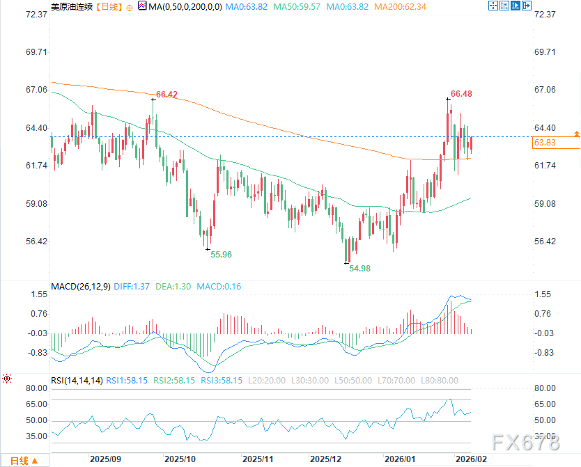 本周市场核心将聚焦美伊谈判进展,这是最大变数。达成协议或施压油价,谈判彻底破裂则大概率重新触发战争溢价买盘,推高油价。汇通财经APP讯——周一(2月9日)欧盘时段,美国西德克萨斯轻质原油(WTI)期货日内先震荡整理,尾盘出现一波明显拉升,价格突破近期震荡区间上沿,短期多头动能增强,盘中报63.8美元/桶,涨幅0.39%。