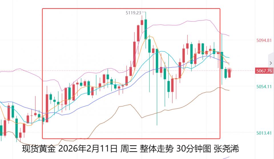 具体走势上,金价自亚市开于5027.38美元/盎司,先行震荡走强,延续至欧盘时段力度加大,连续反弹触及日内高点5119.05美元后,遇阻回落,并在美盘初连续跳水走低,触及日内低点4964.04美元,最终触底回升,并维持盘整,就此收于5084.54美元,日振幅155.01美元,收涨57.16美元,涨幅1.14%。