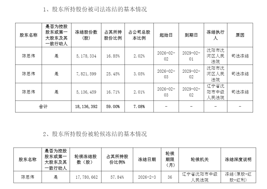 2月3日,辽宁省沈阳市中级人民法院还对陈思伟所持股份进行了轮候冻结。