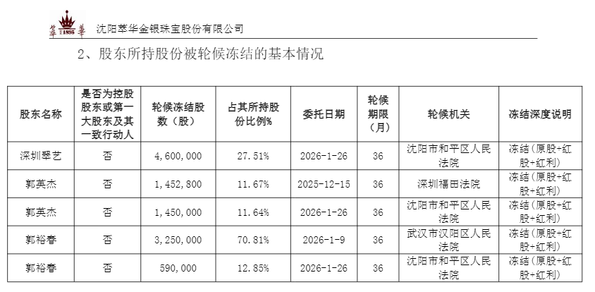 2月2日,萃华珠宝也公告显示,股东深圳翠艺、郭英杰和郭裕春合计9.89%的股份被冻结,申请冻结法院包括武汉市汉阳区人民法院、深圳市福田区人民法院等。