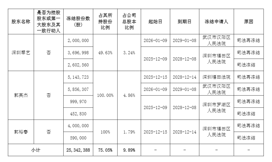 此外,沈阳市和平区人民法院、深圳福田法院、武汉市汉阳区人民法院还对深圳翠艺、郭英杰和郭裕春的部分股份申请了轮候冻结。