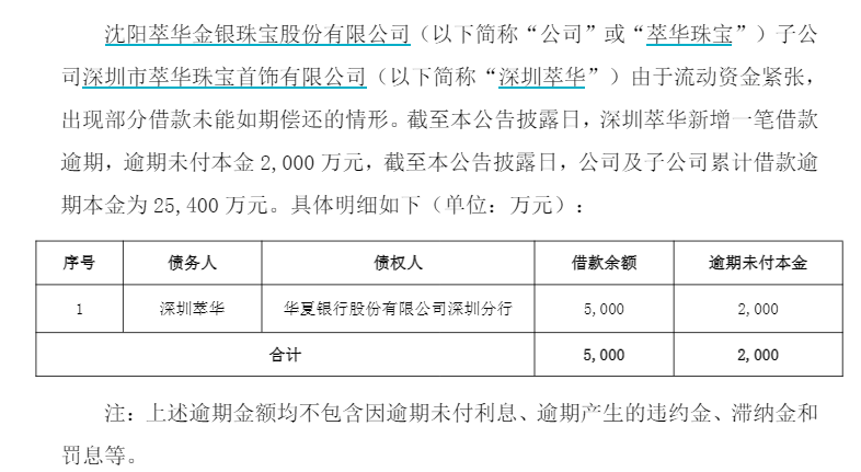 1月28日,萃华珠宝首次公告承认2.34亿元借款逾期,涉及六家银行。2月6日,萃华珠宝再公告称子公司深圳萃华新增逾期未付本金2000万元,债权人为华夏银行股份有限公司深圳分行。