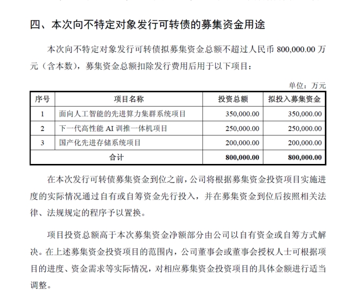 公告显示,此次发行的可转债募集资金计划投向面向人工智能的先进算力集群系统、下一代高性能AI训推一体机及国产化先进存储系统三大项目,拟投入募集资金分别为35亿元、25亿元、20亿元。