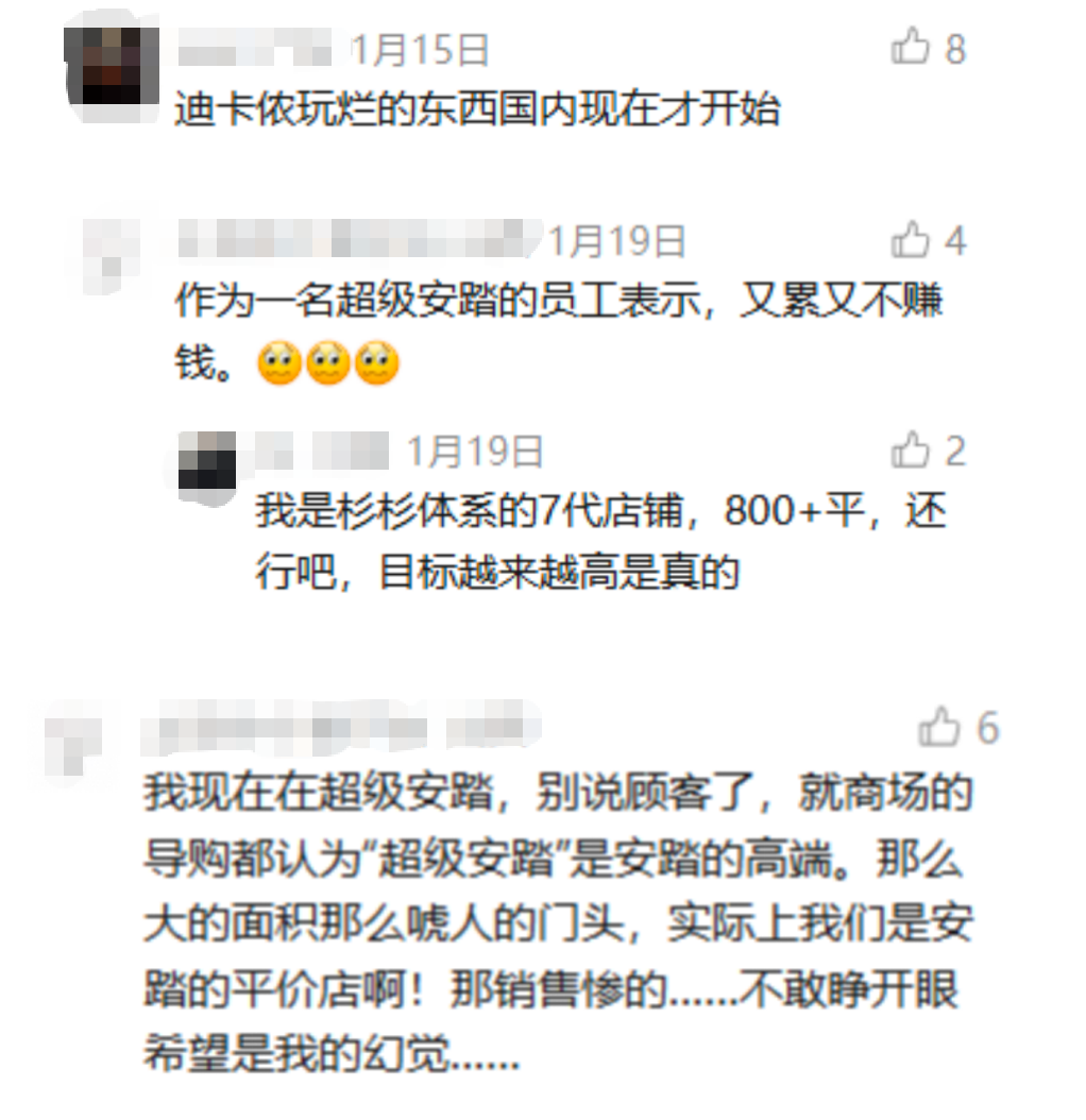 也有自称品牌员工的网友表示,虽然产品零售价低于常规店,但超级安踏设定了更高的营收目标,经营达标都略显困难。