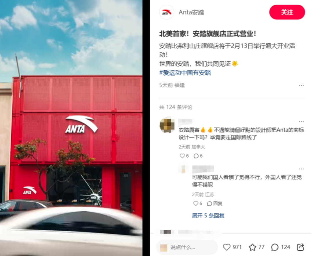 此外,ANTA安踏近日宣布,其位于加利福尼亚州比弗利道330号的美国首店将于2月13日正式开业,NBA球星凯里·欧文(Kyrie Irving)与克莱·汤普森(Klay Thompson)将出席开业剪彩仪式。