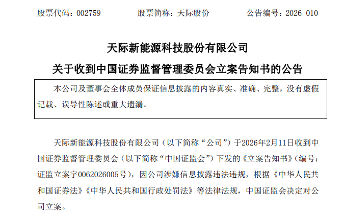 2月11日晚间,天际股份(002759)发布公告,因公司涉嫌信息披露违法违规,中国证券监督管理委员会决定对公司立案。