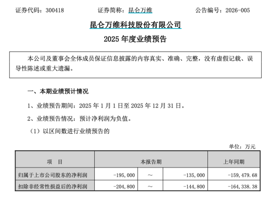 2026年1月底,昆仑万维交出了一份令人担忧的业绩预告。2025年,这家自称“中国领先的人工智能科技企业”预计净利润亏损13.5亿元至19.5亿元,上年同期亏损15.95亿元;扣除非经常性损益后的净利润亏损14.48亿元-20.48亿元,上年同期亏损16.43亿元。这将是其自2015年上市以来的连续第二年巨额亏损。