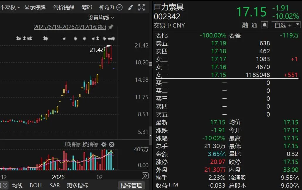 值得一提的是,近期持续大涨的商业航天概念股巨力索具开盘封一字跌停。